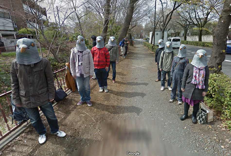 A few years ago while conducting street view photography, one of their cameras captured this strange scene of people dressed like pigeons.