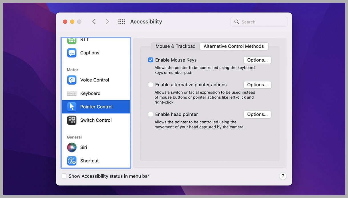 You can also take full control over the pointer with the keyboard. From System Preferences, choose Accessibility, Pointer Control, and Alternative Control Methods, then check the Enable Mouse Keys box. If you have a numeric keypad on your keyboard, you can then use it to move the pointer (4 to go left, 6 to go right, and so on.)