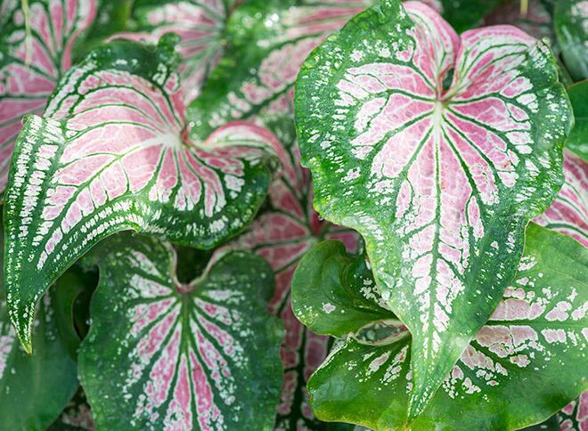 Caladium, also known as elephant ear, has leaves shaped like arrows, hearts or lances, in color combinations of pink, red, white, rose, green and chartreuse. Commonly kept in the home, these poisonous houseplants can irritate the mucus membranes in the mouth, nose, throat and stomach, and cause nausea and vomiting.