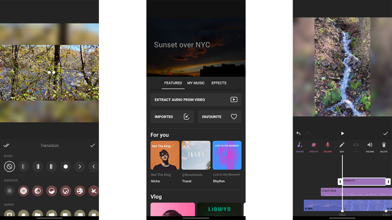 Adobe’s well-designed mobile app for Android and iOS, Rush, syncs projects to your Creative Cloud account so you can continue editing a project on Premiere Pro on the desktop, but you can use it for standalone mobile editing, too. Versions of Rush itself are available for macOS and Windows, as well. You can shoot video in the app either in a simple or advanced mode, which lets you manually set aperture and focus. Once you’ve got some content, you can add titles, soundtrack music, and graphics overlays. For vertical output like TikTok, the Auto Reframe finds the active area of landscape shots and crops accordingly. The standard adjustments for lighting and color are at your disposal, and you can add track overlays and speed changes. One thing you won’t find are project templates like those offered by other apps here. After rendering a project, you can export it directly to Behance, Facebook, Instagram, TikTok, or YouTube.