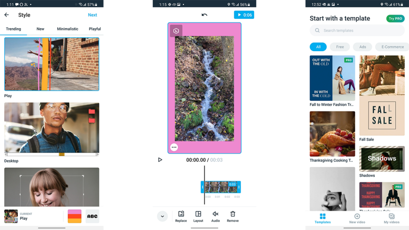 Canva targets small business owners who want to up their social media game to promote products and services. It’s completely template-based and loaded with stock content so that you don’t have to worry about being a pro editor to make things look nice. It lets you make something without needing a single shot of your own. But you can, of course, use your own video clips and photos, as well as do fancy things like stacking simultaneous videos in a vertical layout or use overlays that you can crop. That said, the app lacks some basic video editing features like adjusting light and colors. You can think of it more as the video equivalent of a graphics design application, with strengths in text, shapes, and borders. Canva is available for free use, but many of its features, stock content, and templates require a Pro subscription, which also adds collaboration features for design teams.